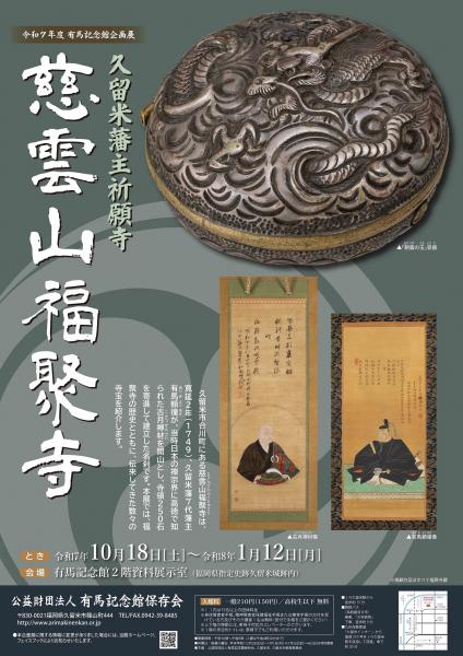 | 開催期間 | 令和7年度有馬記念館企画展「久留米藩主祈願寺 慈雲山福聚寺」 ・会 期 令和7年10月18日(土)~令和8年1月12日(月) ・休館日 毎週火曜日(祝祭日と重なる場合は翌平日)、年末年始(12/28~1/1) |