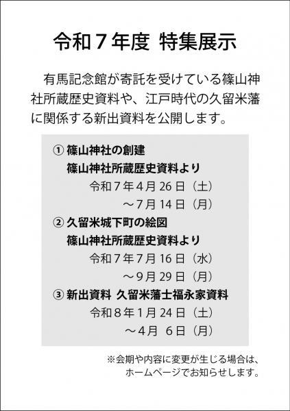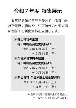 | 開催期間 | 令和7年度特集展示③「新出資料 久留米藩士福永家資料」 ・会 期 令和8年1月24日(土)~4月6日(月) ・休館日 毎週火曜日(祝祭日と重なる場合は翌平日) |