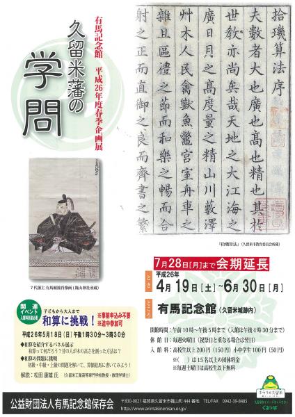 本展では、江戸時代、日本有数の和算研究者であった7代藩主有馬頼徸(よりゆき)の数学書や、8代藩主有馬頼貴(よりたか)が設立した藩校明善堂(現・福岡県立明善高等学校)の旧蔵書などの歴史資料を公開します。