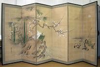 久留米藩の江戸末期の御用絵師、三谷義信(みたに・よしのぶ。1834~1880)が描いた吉祥模様がちりばめられた屏風です。鴛鴦(えんおう)とは、おしどりのことです。