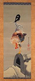 鶏の尾羽が立ち上がり風になびく様子は、静まりかえった情景に躍動感を与えています。落款から、天明九年(1789)の制作と推定されますが、この年は若冲のアトリエと相国寺の九割を焼失した天明の大火の翌年にあたり、不安定な鶏の姿に苦境の若冲を重ねてみる説もあります。
