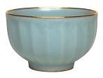 日本に請来された宋時代の青磁のなかでも、本作の釉薬の美しい発色は、青磁の理想とされる雨過晴天色を思わせ、口端の金の覆輪が青色を引き立てています。ゆるやかな胴には20本の蓮弁のしのぎ文が刻まれ、やや大きめの高台をもちます。