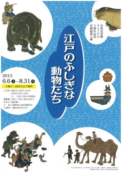 | 開催期間 | 有馬記念館リニューアル5周年記念 企画展第①弾「江戸のふしぎな動物たち」 ・会期:平成27年6月6日(土)~8月31日(月) ・休館日:毎週火曜日(祝祭日と重なる場合は翌日) |