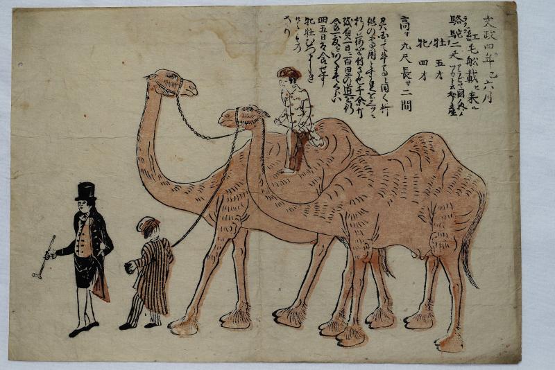 文政4年(1821)、オランダ船に乗って、雌雄2頭のラクダが長崎にやって来ました。しばらく出島で飼育され、多くの人が見学に訪れたといいます。また、日本では珍しいラクダの様子は、長崎の絵師たちによって描かれ、版画として広まっていきました。この作品もそうした長崎版画の一つです。
