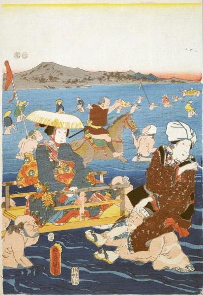 江戸時代を通して、大井川には橋が架けられなっかたため、人々は肩車や台、馬に乗って川を渡りました。水かさが人の脇の高さを越えると「川留」といって、通行禁止になりました。川の水が引くまで、何日間も待たされることがあり、「箱根八里は馬でも越すが、越すに越せれぬ大井川」と言われました。