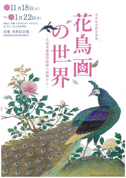 | 開催期間 | 平成29年度有馬記念館企画展「花鳥画の世界-久留米藩御用絵師の絵画から-」 ・会期:平成29年11月18日(土)~平成30年1月22日(月) ・休館日:毎週火曜日、年末年始12月28日(木)~1月1日(月)は休館。平成30年 1月2日(火)~1月4日(木)は特別開館。 |