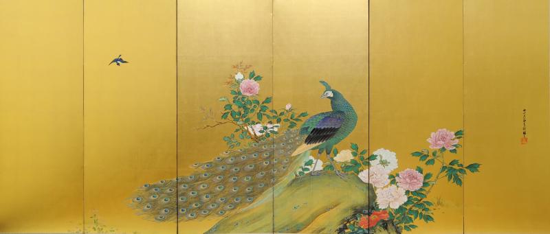 三谷勝沢有信「牡丹孔雀図屏風」大正6年(1917)