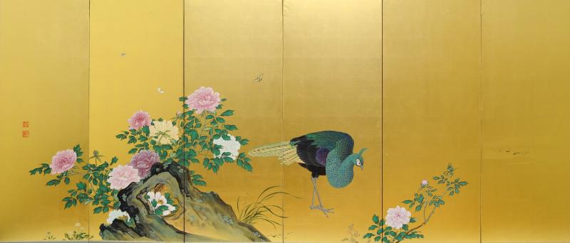 左右に雄と雌の孔雀、牡丹を組み合わせて描いた屏風。中国では、牡丹は花の王、孔雀は鳥の王とされ、両者を組み合わせた絵は豊かさやめでたさの象徴として好まれた。