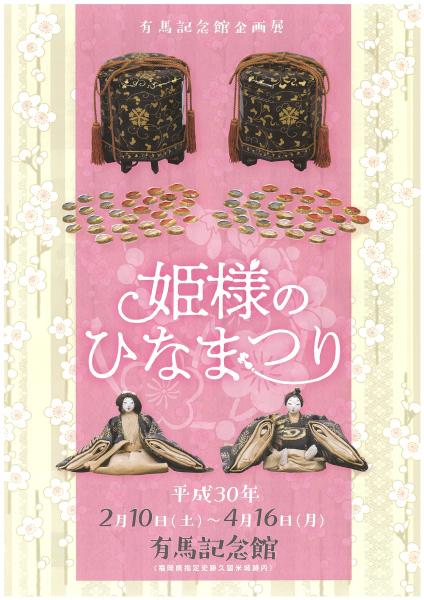 | 開催期間 | 平成29年度有馬記念館企画展「姫様のひなまつり」 ・会期:平成30年2月10日(土)~平成30年4月16日(月) ・休館日:毎週火曜日 |