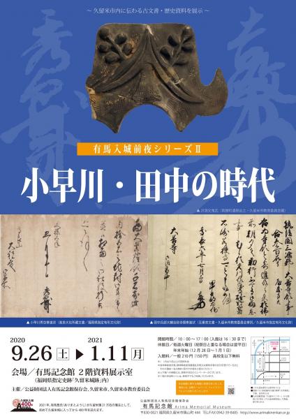 | 開催期間 | 令和2年度有馬記念館企画展「有馬入城前夜シリーズⅡー小早川・田中の時代」 ・会 期 令和2年9月26日(土)~令和3年1月11日(月) ・休館日 毎週火曜日(祝祭日と重なる場合は翌平日) 12月28日~1月1日 |