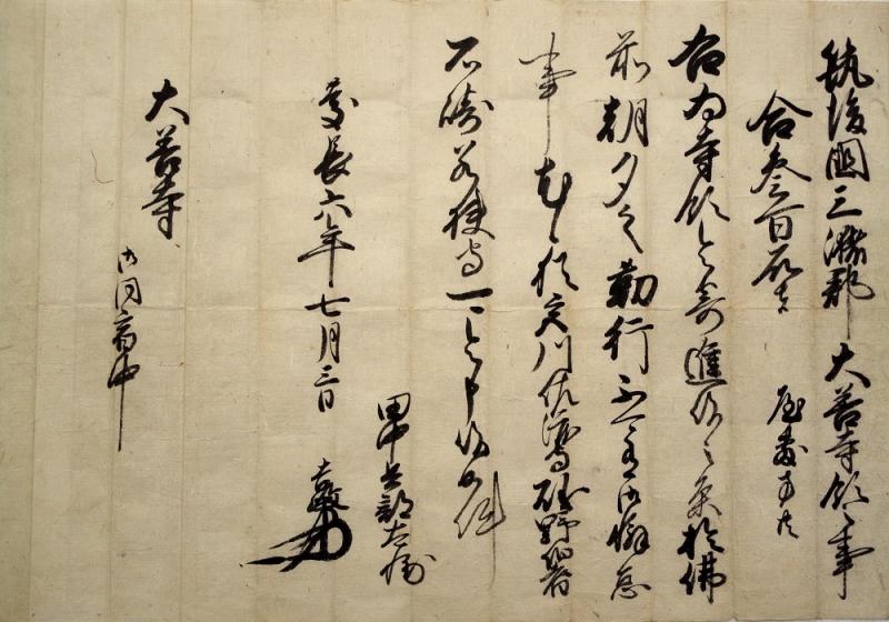 慶長6年(1601)7月3日付けで、田中吉政から三潴郡大善寺に対して、300石を寄進し、朝夕の勤行を怠ることなく執り行うよう命じた文書です。