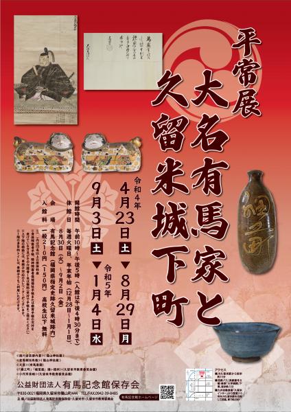 | 開催期間 | 令和4年度有馬記念館平常展「大名有馬家と久留米城下町」(後期) ・会 期 令和4年9月3日(土)~令和5年1月4日(水) 前期:令和4年4月23日(土)~8月28日(月) 後期:9月3日(土)~令和5年1月4日(水) ・休館日 毎週火曜日(祝祭日と重なる場合は翌平日) 8月30日~9月2日 12月28日~令和5年1月1日 |