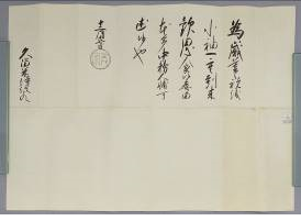 7代藩主有馬頼徸(よりゆき)が8代将軍徳川吉宗に歳暮の祝儀として小袖一重を献上し、その返礼として吉宗が頼徸宛てに発給した御内書です。ちりめん状の皺(しわ)加工を施した檀紙(だんし)という高級和紙を用い、「吉宗」の黒印があります。この御内書は文末に記載された老中の「本多中務大輔(なかつかさのたいふ)(忠良(ただなが))」を通して、有馬家の使者へ渡されました。