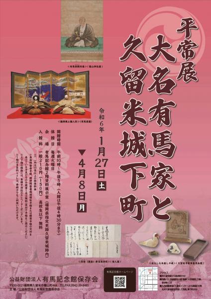 | 開催期間 | 令和5年度有馬記念館平常展「大名有馬家と久留米城下町」(後期) ・会 期 令和6年1月27日(土)~令和6年4月8日(月) ・休館日 毎週火曜日(祝祭日と重なる場合は翌平日) |