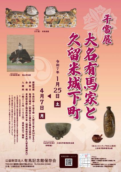 | 開催期間 | 令和6年度有馬記念館企画展「大名有馬家と久留米城下町」 ・会 期 令和7年1月25日(土)~4月7日(月) ・休館日 毎週火曜日(祝祭日と重なる場合は翌平日) |