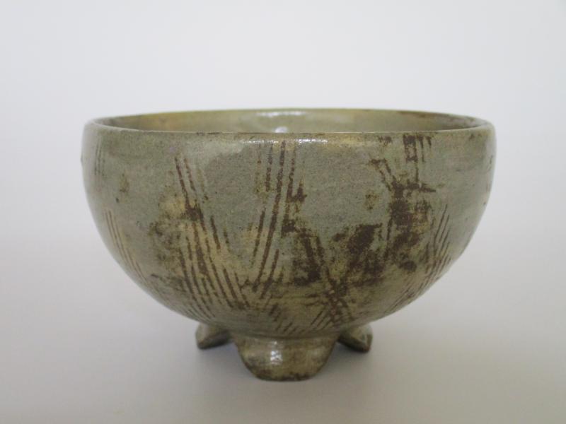 金海窯(金海は朝鮮半島慶尚南道の釜山付近の地名)で焼かれた高麗茶碗を写したものです。ふっくらとした丸みのある形で、胴部には「猫掻」と呼ばれる、猫の爪で引っ掻いたような短い櫛目状の刻線がほどこされています。