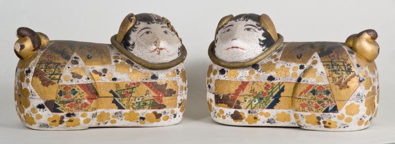 犬張り子とも呼ばれ、雌雄一対で作られます。犬はお産が軽く魔除けとされたので、中にお守りなどを納めて安産を祈願しました。重要な婚礼道具のひとつで、婚礼行列では姫様とともにお輿入れしました。