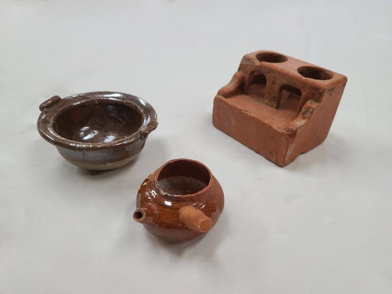 陶磁器や土製の、手作りのままごと道具です。発掘調査で数多く出土することから、子どもの遊びの定番だったことがうかがえます。 このほかにも、城下町の人々の暮らしに触れられる出土品を、「あじわう」、「かざる」などのテーマごとに紹介します。