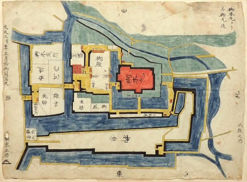 福永家資料には、久留米城及び城下町の絵図6枚が伝わります。そのうち、城内の本丸、二ノ丸、三ノ丸、柳原(やなぎはら)を描いた1枚です。久留米城は本丸には天守は築かれず、政治の場としての本丸御殿(ごてん)が建てられました。二ノ丸には藩主の生活の場としての「御殿」、三ノ丸には家老屋敷が置かれ、柳原には藩主の庭園が造られました。