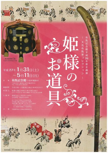 | 開催期間 | 有馬記念館 平成26年度企画展 ~大名有馬家コレクション~「姫様のお道具」 ・会期:平成27年1月31日(土)~5月11日(月) ・休館日:毎週火曜日(祝祭日と重なる場合は翌日) ただし5月5日(火・祝)は開館、5月7日(木)は休館 |