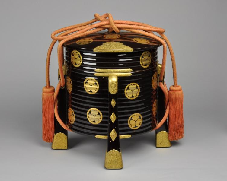 平成24年度に久留米市に寄贈された「黒漆塗葵紋行器(ほかい)」は初公開の資料となります。行器とは戸外へ食物を運んだり、贈答品の運搬などに用いる容器です。徳川家の葵紋が散らされており、元は精姫の所要品でした。有馬家の御用達であった市内の和菓子店が譲り受けたものです。このような行器や犬筥(いぬばこ)(張子の犬)、豪華な装飾が施された薙刀の拵(外装)など、姫様の輿入れ行列で運ばれた品々をご覧いただき、華やかな行列の雰囲気を感じていただきたいと思います。