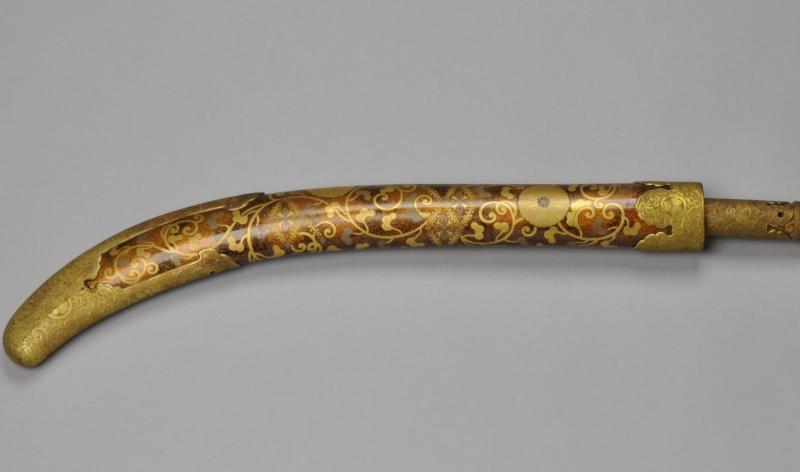 精姫(あきひめ)の所用品。梨の肌のように金箔を蒔いた梨地に、金銀の蒔絵で唐草を描き、精姫の実家有栖川宮(ありすがわのみや)家の菊紋を散らしています。金具には徳川家の葵紋があしらわれています。薙刀は、江戸時代には重要な婚礼道具として用いられたため、金銀の蒔絵や螺鈿細工などを施した豪華な拵が多く作られました。
