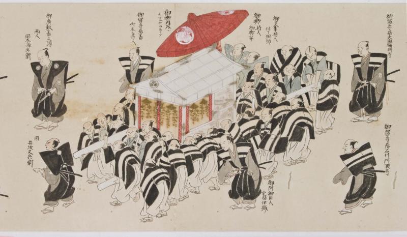 全長14mを超える絵巻で、天明七年(1787)、徳川将軍家の種姫が紀州藩主の徳川治宝(はるとみ)に嫁ぐため、江戸城から紀州藩邸へ向かう道中が描かれています。有馬家が将軍家の精姫を迎えるための参考資料として描かせた、あるいは収集したものと考えられます。行列は魔除けの犬筥(いぬばこ)を載せた輿(こし)を先頭に、貝桶、侍女の輿、弓、薙刀、守り刀、姫様の輿、太刀、傘、道具類、侍女の輿と続き、その間を藩士が警護しています。