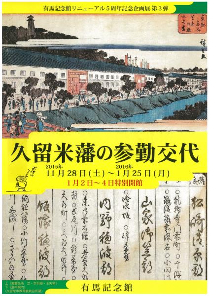 | 開催期間 | 有馬記念館リニューアル5周年記念 企画展第③弾「久留米藩の参勤交代」 ・会期:平成27年11月28日(土)~平成28年1月25日(月) ・休館日:毎週火曜日(祝祭日と重なる場合は翌日) ただし、年末年始12月28日(月)~1月1日(金・祝)は休館。平成28年 1月2日~1月4日は特別開館。 |