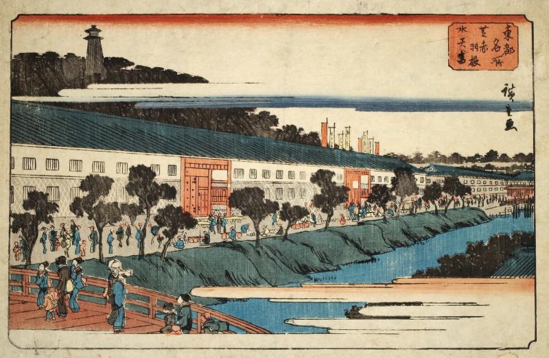 久留米藩の江戸上屋敷は、三田(東京都港区)にありました。将軍の菩提寺である増上寺にほど近く、その火の番を命ぜられたため、屋敷の中に火の見櫓(画面左上)が建てられています。また、文政元年(1818)には、久留米から水天宮が分祀され、賑やかに幟が立ち(画面中央)、多くの参拝者を集めました。