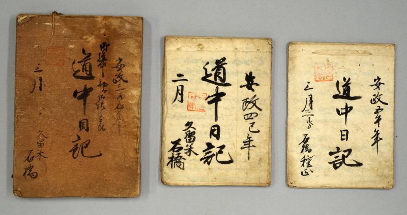 久留米藩士石橋銈太郎(けいたろう)の道中日記です。石橋は、安政3年(1856)に11代藩主有馬頼咸(よりしげ)に従って、初めて参勤交代の供をしました。江戸に到着した日の筆は力強く「千秋万歳、目出度可悦」(せんじゅうばんざい めでたくよろこぶべし)と書いています。