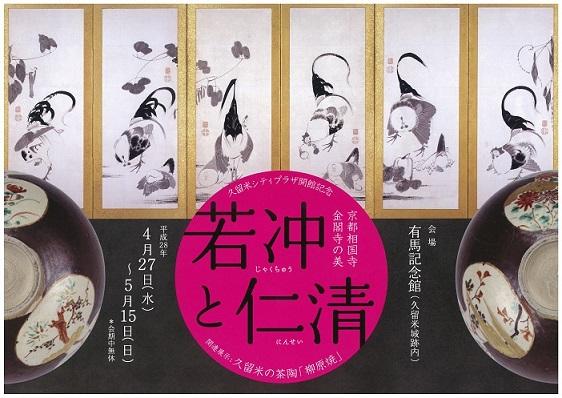 | 開催期間 | 久留米シティプラザ開館記念 京都相国寺・金閣寺の美「若冲と仁清」 関連展示:久留米の茶陶「柳原焼」 ・会期:平成28年4月27日(水)~平成28年5月15日(日) ・休館日:上記期間中無休 |