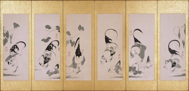 鶏の様々な姿を描いた水墨画を六曲一双の屏風に仕立てたもの。雄鶏と雌鶏、ひな鶏を植物と組み合わせて描いています。自由闊達な筆遣いで、鶏を得意とした若冲の本領が発揮されています。