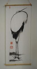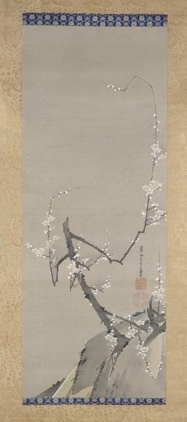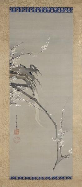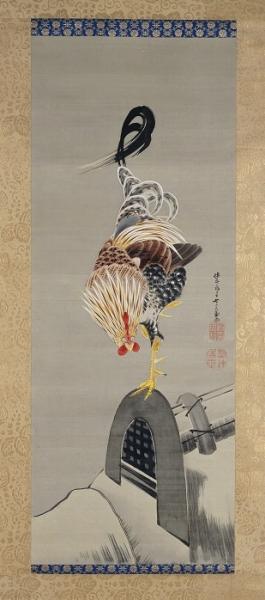 左右には雪中に花開く白梅を、中幅には雪の積もった茅葺の家の軒先に止まる雄鶏を、透明感のある色使いで描いています。鶏は、緻密に表現された羽と、大胆に描かれた尾羽の対比が見どころです。くねくねと枝を伸ばす梅の表現もユニークです。