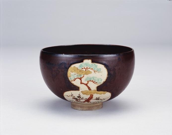 三方に抜いた瓢形の中に、松竹梅、桜、菊が細やかな筆遣いで描かれ、深い茶色の柿釉がその華やかさを引き立てています。繊細な絵付けの色絵に、仁清の特徴がよく現れた優美な作品です。