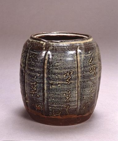 胴部に縦に筋を入れ、木瓜形にした水指。「水ぬるむ 登里ての 春や 柳原 有作」の彫銘が入っています。藍色で、乳白色の斑文が浮かぶ海鼠釉がかかり、底部に暗褐色の土が現れています。