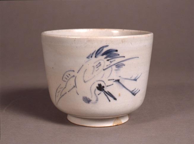 白地に呉須(藍色の顔料)で鶴を描いた染付の茶碗です。一方には首を曲げ羽根を広げて飛ぶ姿が、他方には前かがみで歩く姿が表されています。高台内に「柳原」の陰刻長円印が押されています。