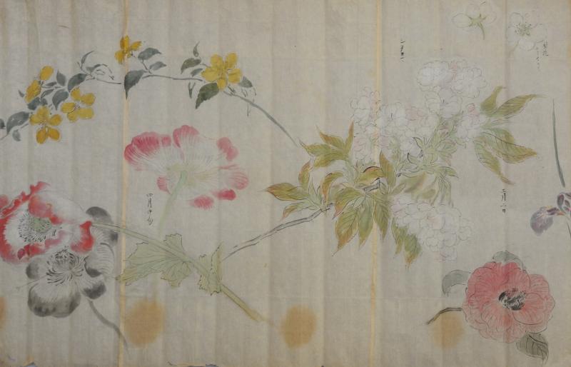 花鳥画は、草花や鳥などを組み合わせて描いた絵画で、屏風絵(びょうぶえ)や襖絵(ふすまえ)などの形で親しまれてきました。華やかな花鳥画の屏風や掛幅(かけふく)のほか、約5,500点にも上る粉本(ふんぽん)(模写や下絵、写生など)から、花鳥画に関する資料を展示いたします。