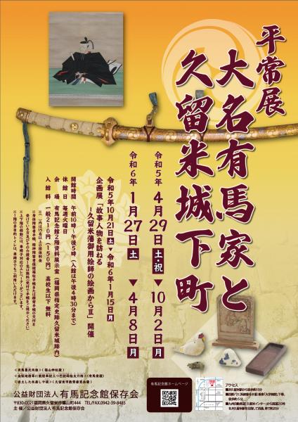 | 開催期間 | 令和5年度有馬記念館平常展「大名有馬家と久留米城下町」 ・会 期 令和5年4月29日(土・祝)~令和6年4月8日(月) 前期:令和5年4月29日(土・祝)~10月2日(月) 後期:令和6年1月27日(土)~4月8日(月) ・休館日 毎週火曜日 |