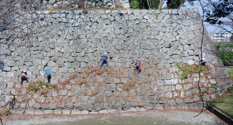 10月31日(日)、久留米山岳会の皆様十数名により、久留米城石垣の除草作業が行われ、往時を偲ぶような石垣が姿を見せています。 正面石垣は堀に面しているため高所作業車を使えません。そこで、久留米山岳会の皆さんが日頃培った登山技術を使い、ロープで吊るされた状態で、手作業で石垣に蔓延った草を一つ一つ丁寧にとっていきました。 有馬記念館では、今月29日(月)まで「有馬の城づくり、町づくり」展を開催しています。 久留米城跡見学とともに、有馬記念館への皆様のご来館をお持ちいたしています。