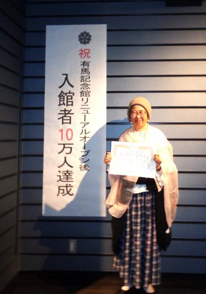 10万人目の入館者となったのは、長崎市からお越しになった井口繭子様。当館、公益財団法人有馬記念館保存会 事務局長 井上英俊より記念品を贈呈いたしました。